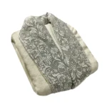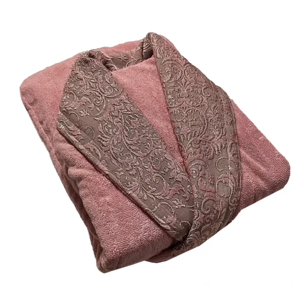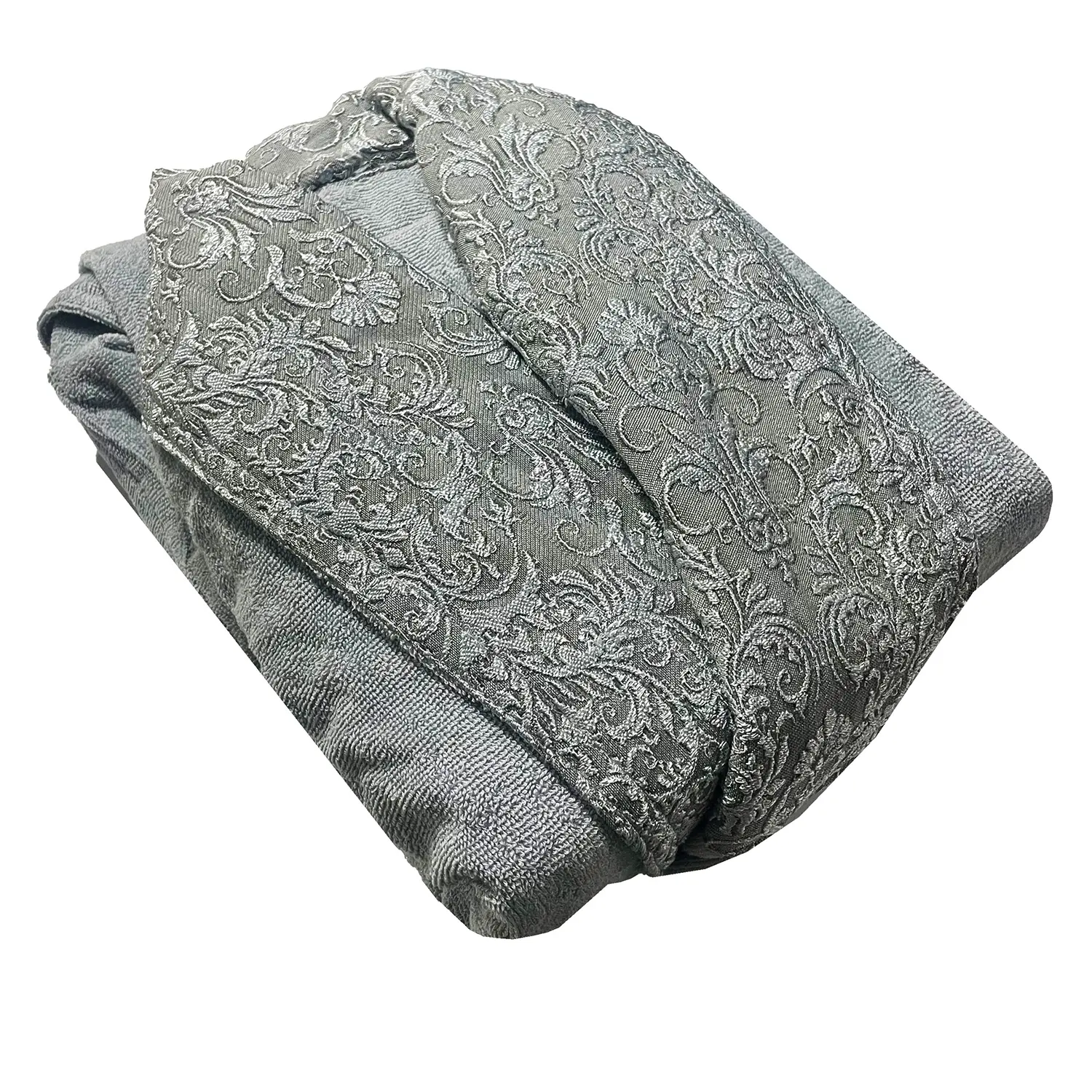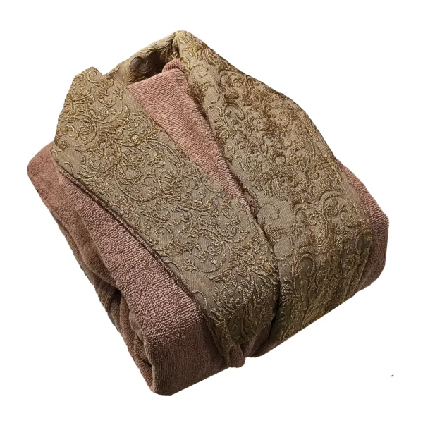 - طرح گیپور ابریشمی: اصلیترین نقطه قوت این حوله، تزئینات خیرهکننده گیپور ابریشمی آن است. این گیپور ظریف، به زیبایی در قسمتهای مختلف حوله، به ویژه روی یقه و سرآستینها، به کار رفته و جلوهای لوکس و زنانه به آن بخشیده است. ابریشم به کار رفته در گیپور، با درخشندگی ملایم خود، حسی از لطافت و ثروت را منتقل میکند. این تزئینات، این حوله را به یک گزینه عالی برای حوله عروس و جهیزیه تبدیل کرده است.